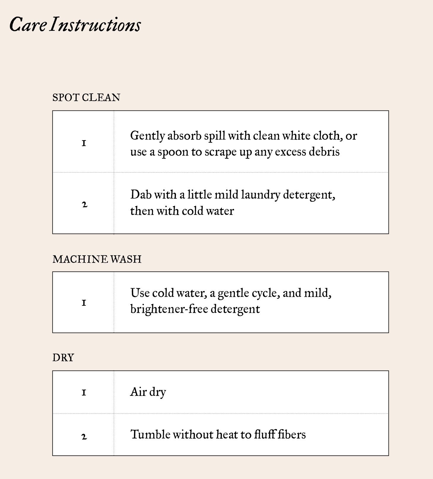 - Always air dry, then tumble on low heat to fluff.