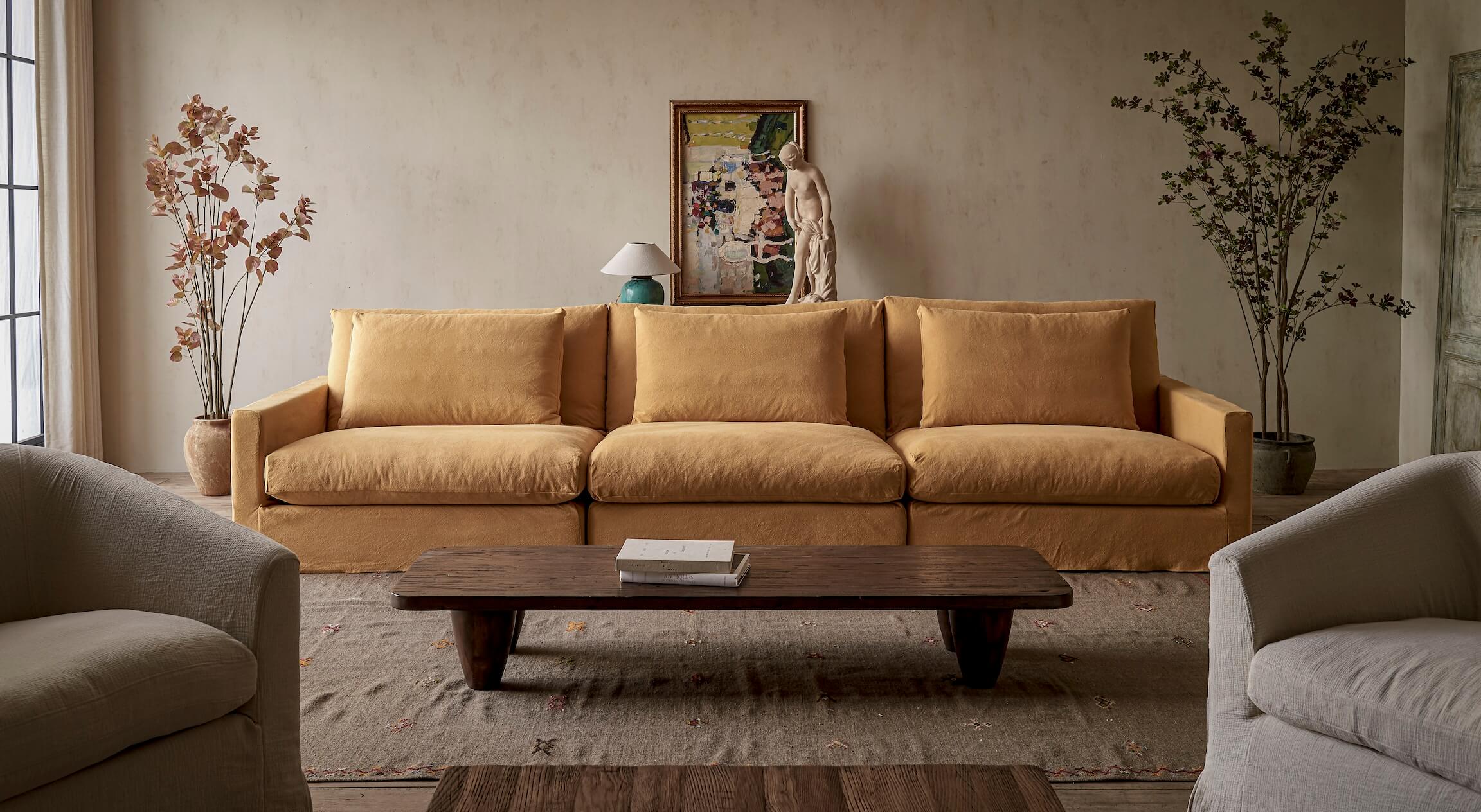 A joyful saffron yellow with marigold undertones. Every fiber of this stunning cotton-linen blend is saturated with dye before weaving for vibrant, nuanced color. Thread-Dyed Cotton Linen is exceptionally colorfast and can be spot-cleaned if you stick to the care instructions.