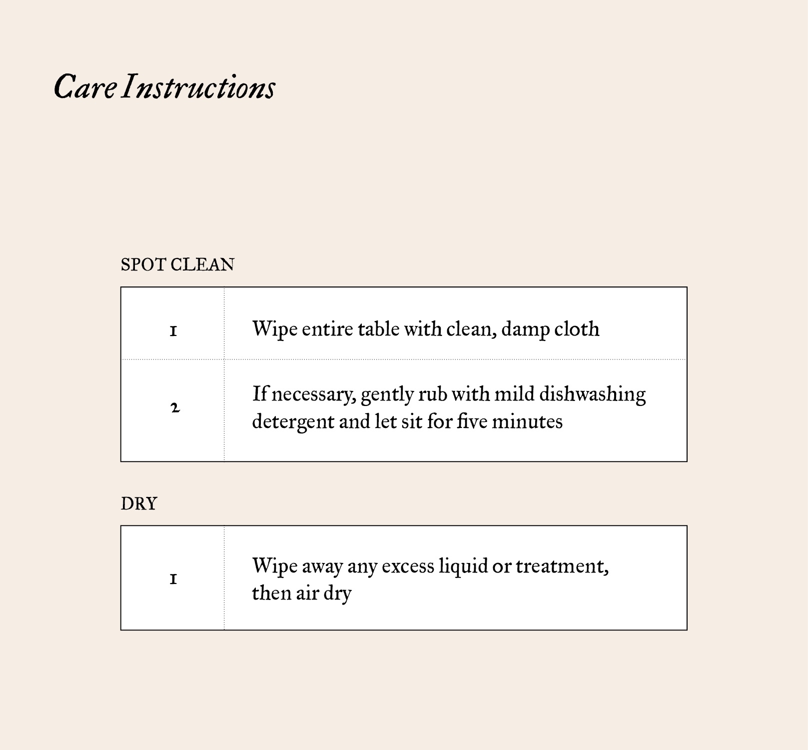 - Avoid placing food or beverages directly on the tabletop to avoid rings and stains. Always use a coaster or trivet and take care when placing or moving heavy or sharp objects on the tabletop to prevent scratches.