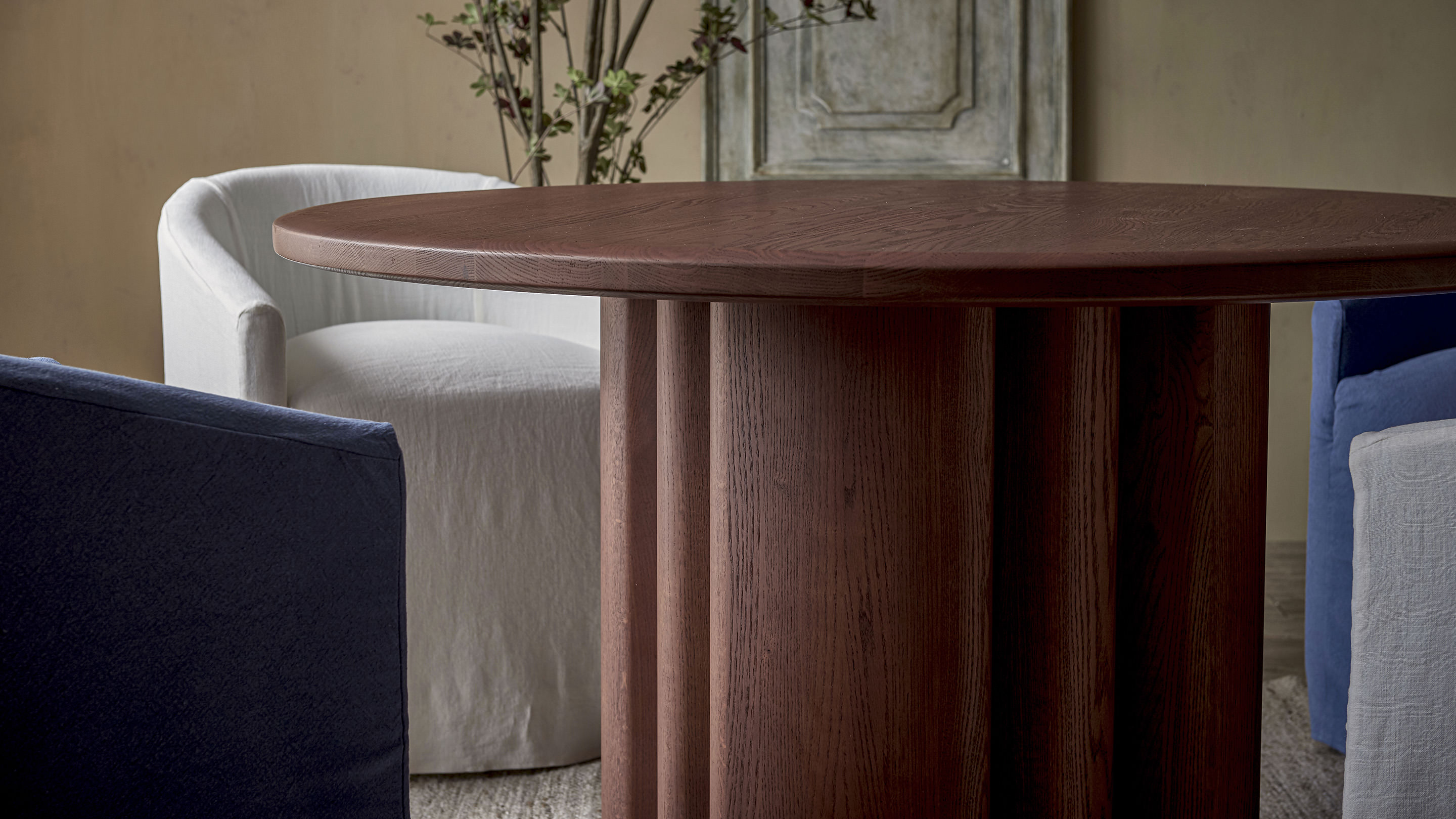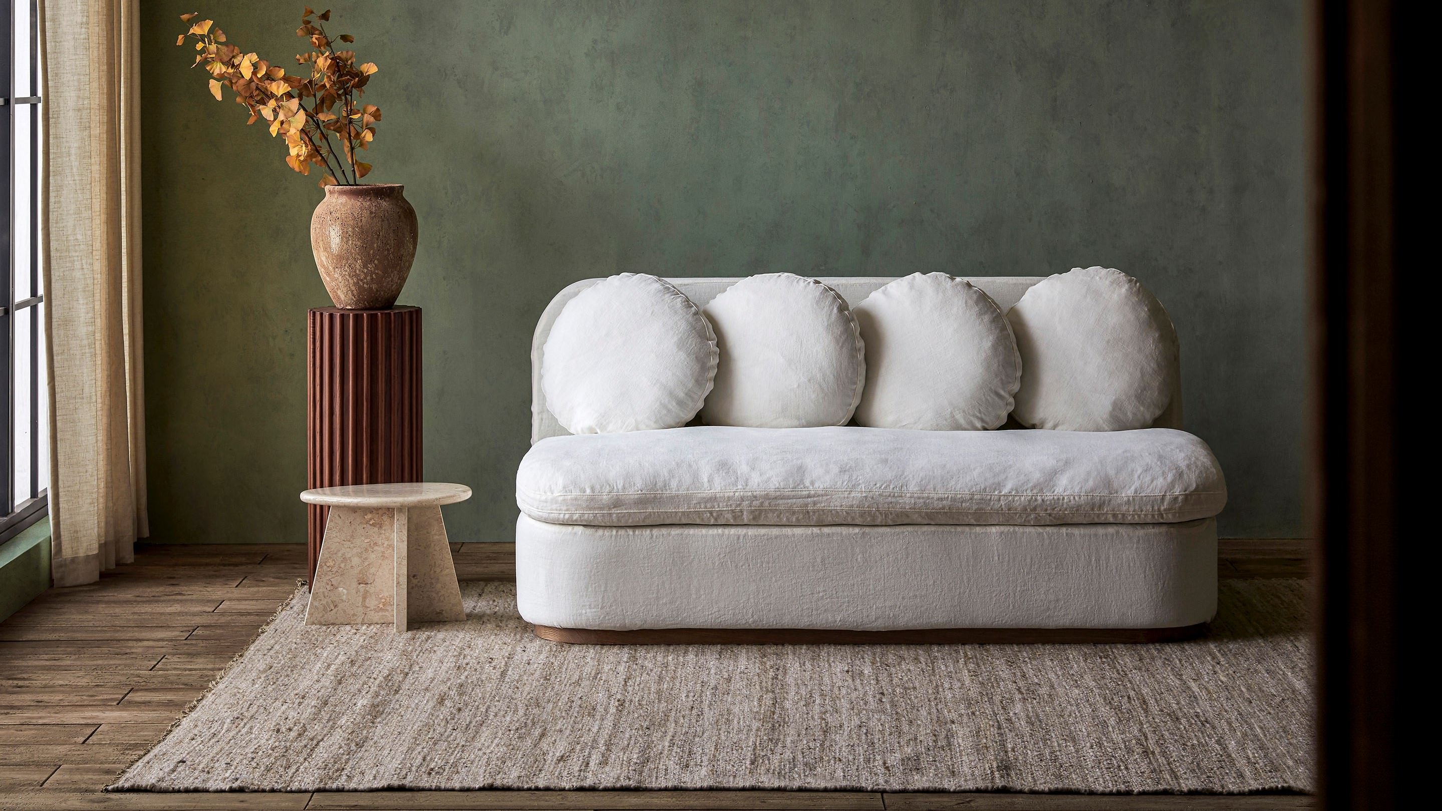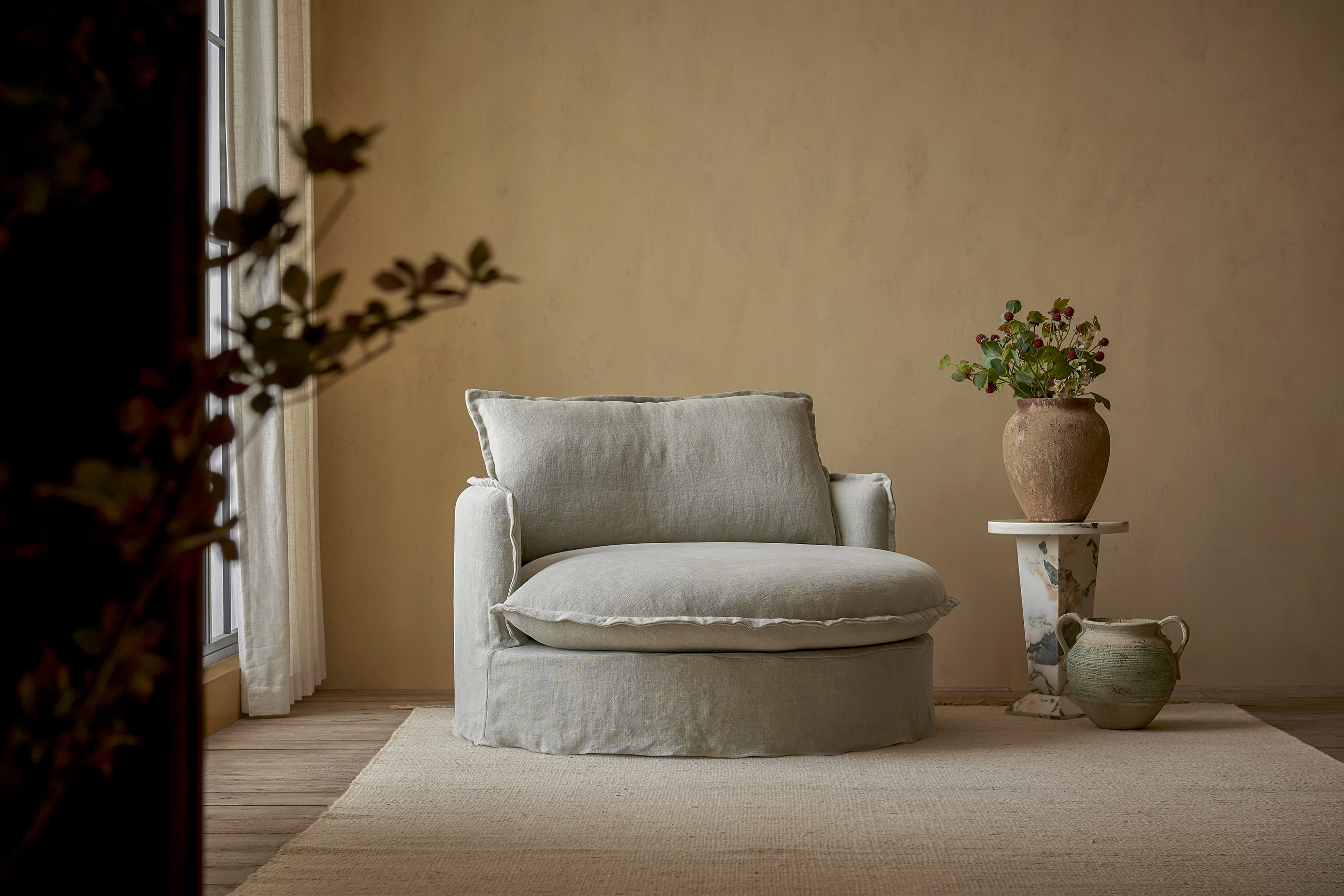 Olea is proof that luxurious comfort can be cute as a button. The plush, delightfully playful round back cushions and a fluffy bench cushion make this collection huggably soft. And with the material contrast of a neatly fixed slipcover and solid oak base, Olea has undeniable star quality.