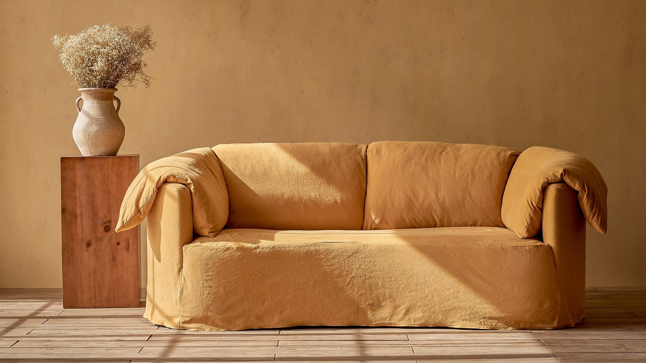 An antique-inspired jewel wrapped in contemporary comfort, with oversized cushions draped over a minimal curvy frame—a beautiful, irresistibly cozy contradiction.