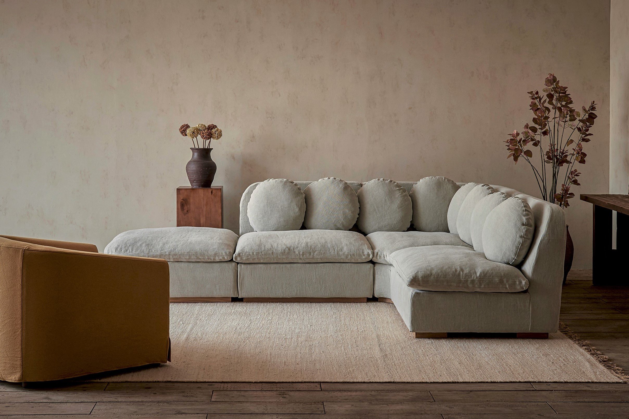 We gave our darling whimsical showstopper a modular makeover. Olea’s signature plush, rounded back cushions, squishy seat, and a neatly fixed slipcover take shape as a customizable sectional, for endless, playful possibilities that are both flirtatious and refined.