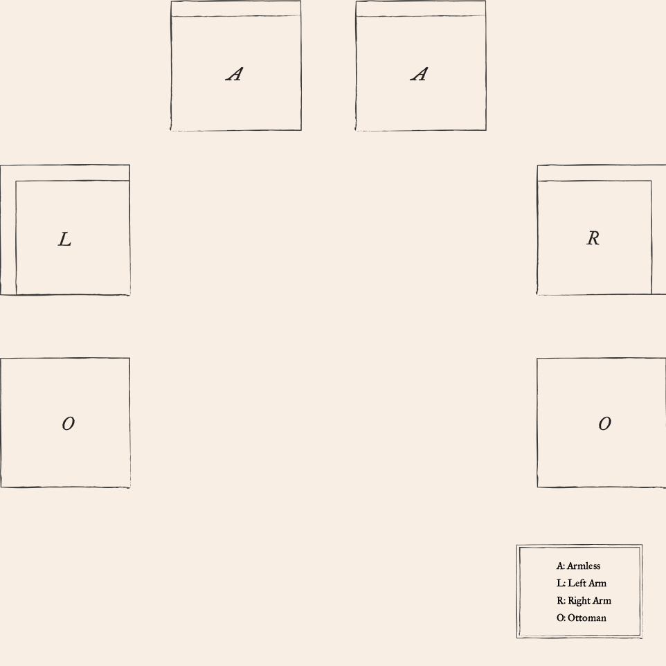 - Armless chair: 39”W x 35”D x 33”H