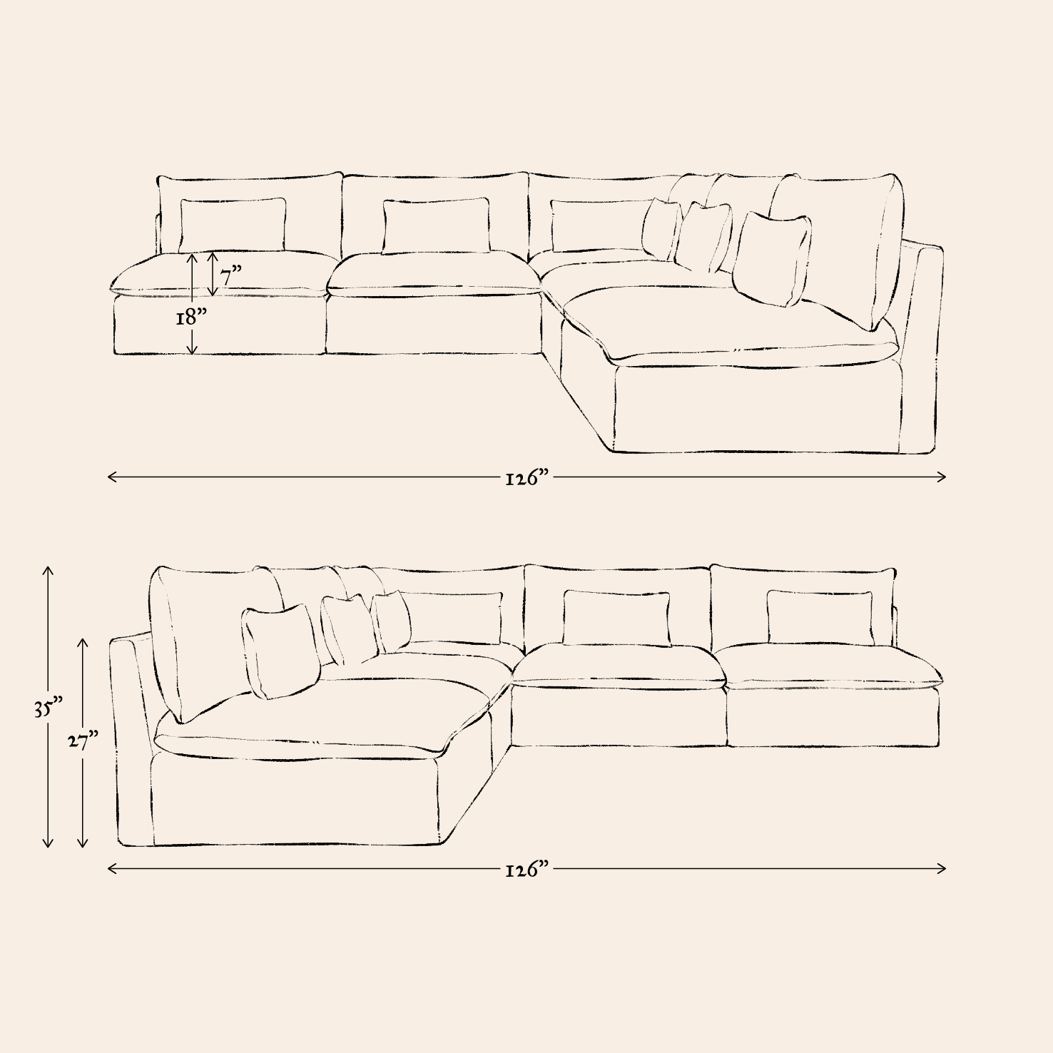 Our sectionals are all modular, meaning pieces can be arranged and rearranged to create an ideal configuration for your space. All modular pieces (including ottomans) connect to each other using zinc alligator clips fixed to the underside.