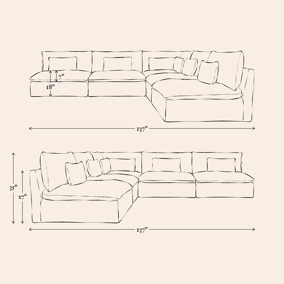 Our sectionals are all modular, meaning pieces can be arranged and rearranged to create an ideal configuration for your space. All modular pieces (including ottomans) connect to each other using zinc alligator clips fixed to the underside.