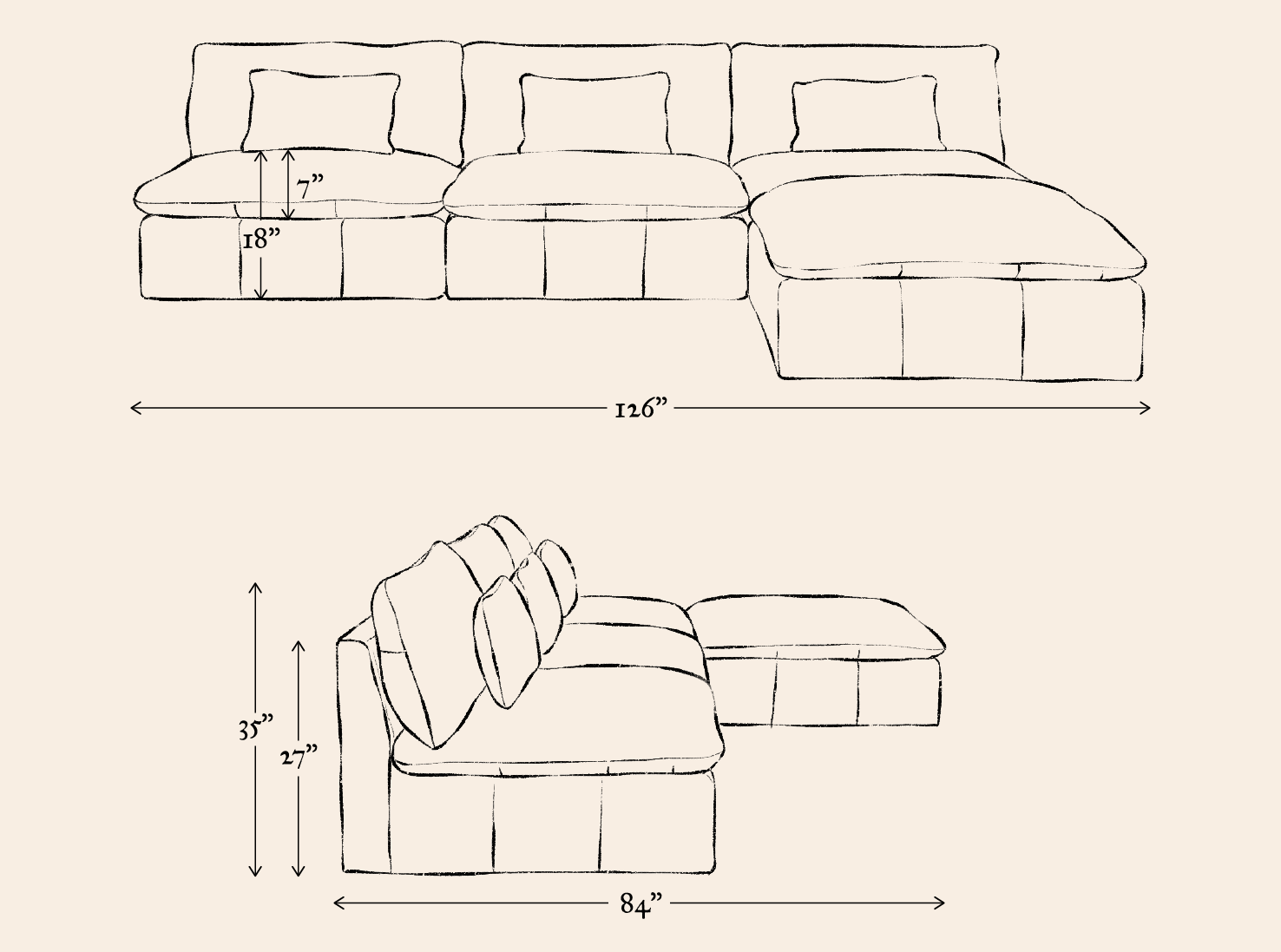 - Overall dimensions: 126”W x 84”D x 35”H