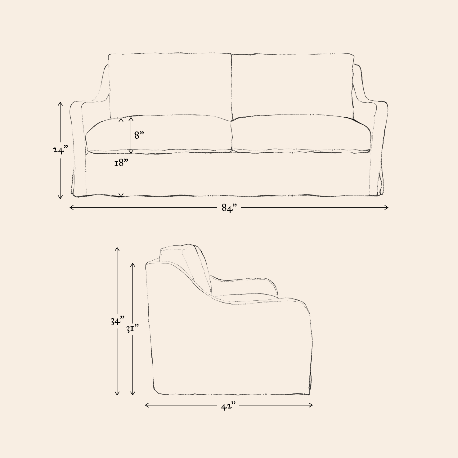 - Overall dimensions: 84”W x 42”D x 34”H
