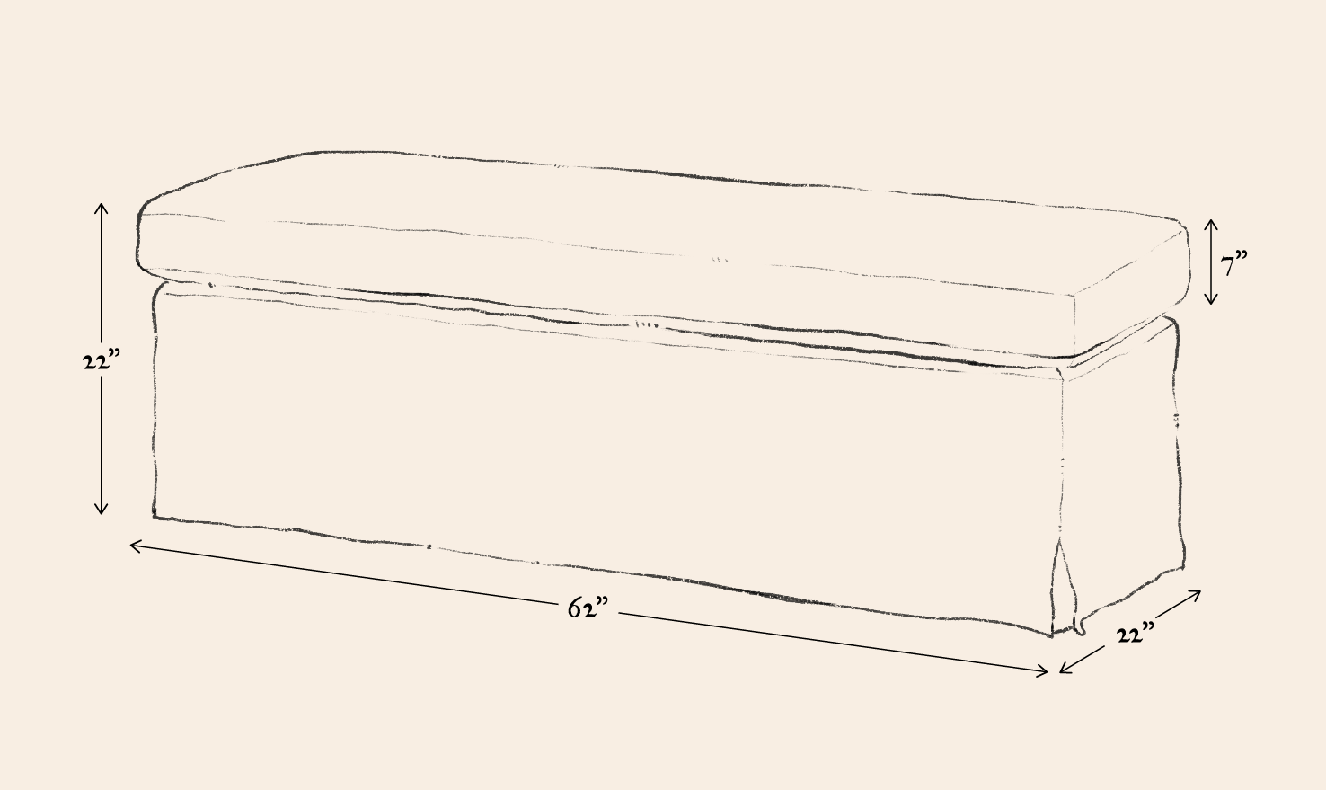 Esmé's Storage Bench seat cushion contains three layers: your choice of loose fill (Feather Down or Poly Fill) at the top and bottom, and a “support layer” of high-density foam sandwiched between the fill.