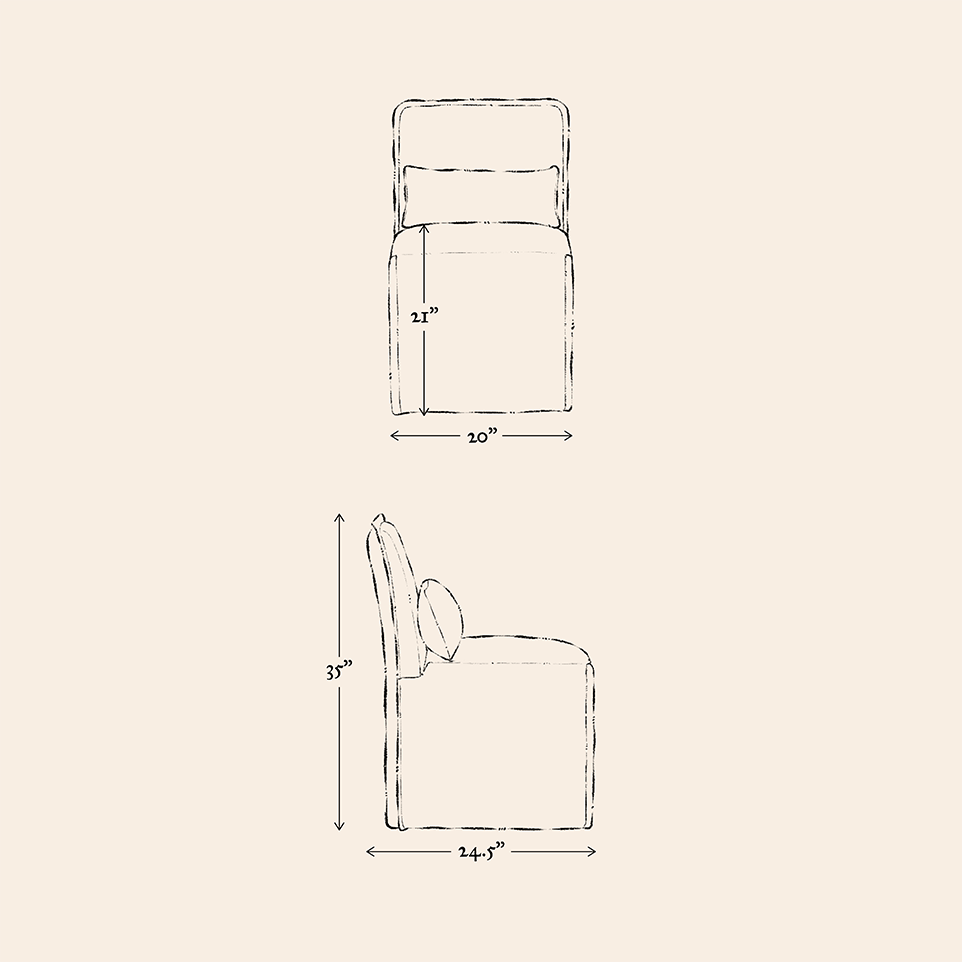 The fixed seat cushion of the Melo Armless Dining Chairs contain three layers: your choice of loose fill (Feather Down or Poly Fill) sits on top of two layers of high-density foam: a “support layer” and a “foundational layer” for the perk needed to dine comfortably.