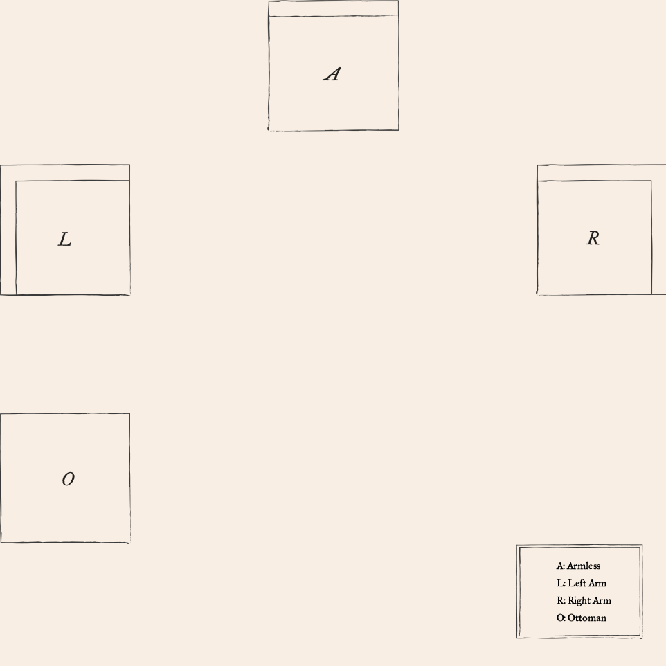 - Armless chair: 41”W x 41”D x 33”H