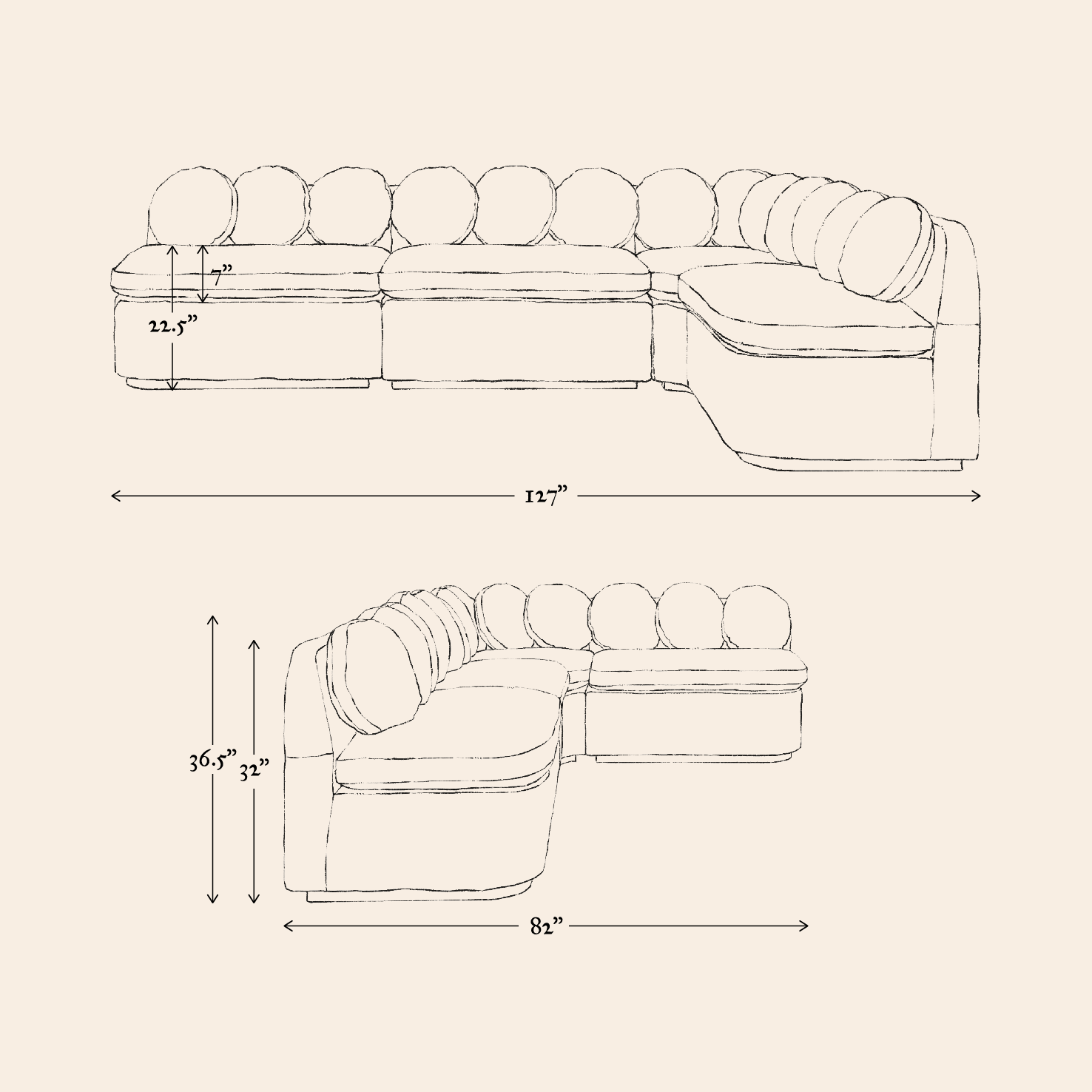 - Overall dimensions: 127”W x 82”D x 36.5”H