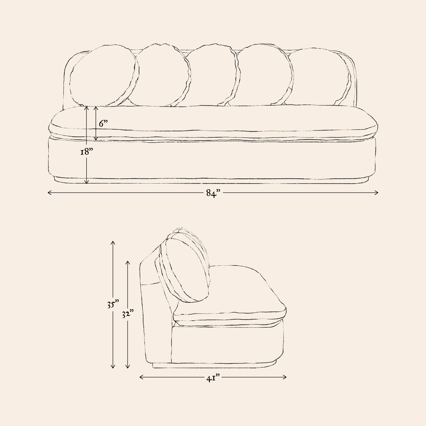 - Overall dimensions: 84”W x 41”D x 35”H